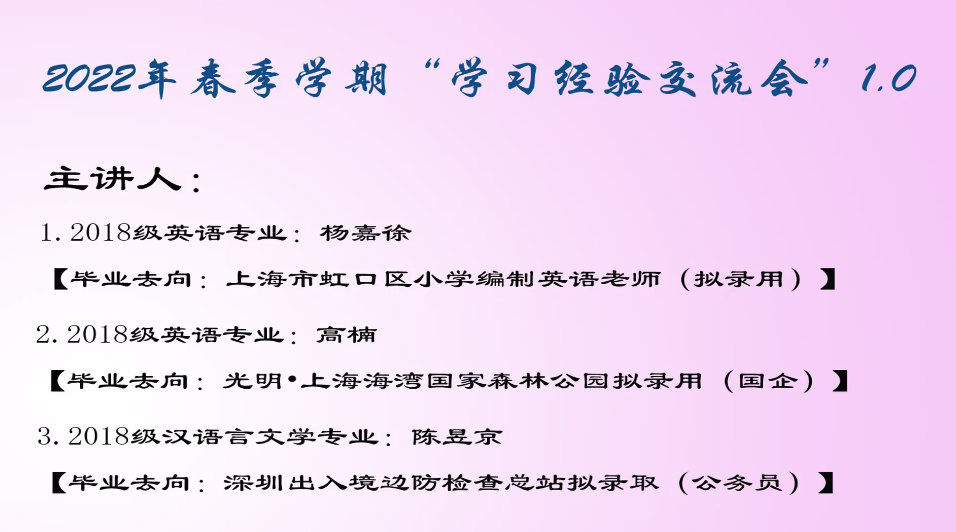 4月12日下午,“学习经验交流会”首场活动通过腾讯会议在线上顺利举办。本场活动聚焦“就业”,2018级英语专业杨嘉徐、高楠,2018级汉语言文学专业陈昱京担任主讲嘉宾。即将成为小学英语教师的杨嘉徐讲述了自己筹备考研、留学申请和求职的详细经历,强调了做好人生规划的重要性;被光明·上海海湾国家森林公园录用的高楠不仅在学习、求职方面给予建议,还在校园生活问题上贴心支招;公考上岸的陈昱京详尽地介绍了公务员考试的流程,长长的干货清单凝练着公考人的学习生活点滴。