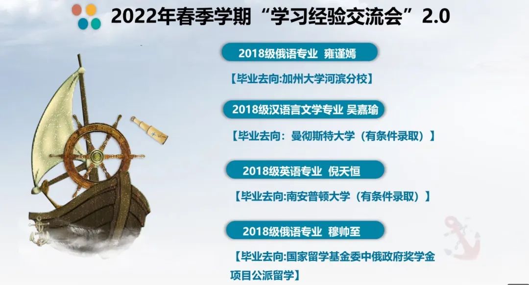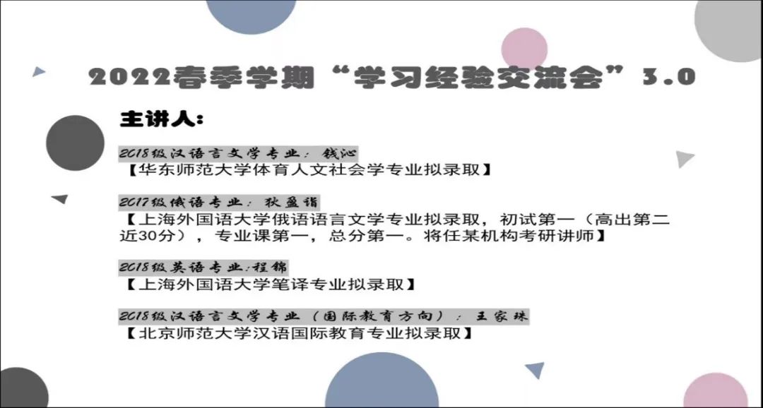 在抗击疫情的特殊时期,为促进学风建设,引导学生聚焦学业、形成自觉自律的良好习惯,打造分享经验、互相激励的朋辈互助网络学习空间,语言文化学院组织发起2022年春季学期“学习经验交流会”系列活动。