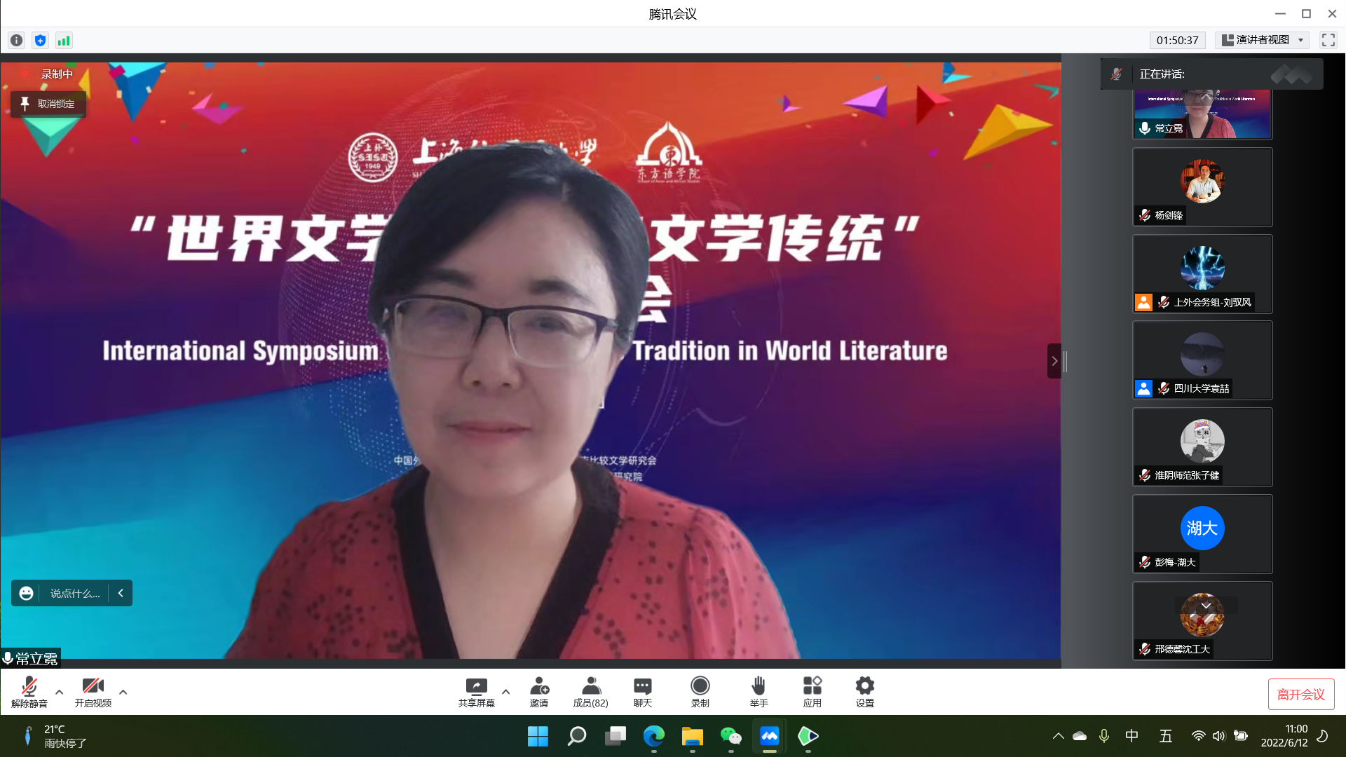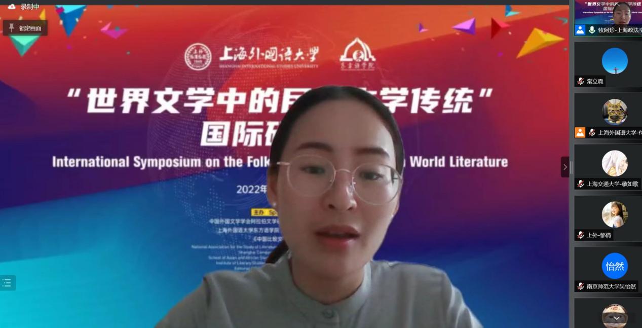 为继承发扬民族民间文学艺术传统,在世界文学艺术领域鲜明确立中国气派、中国风范,2022年6月11-12日由中国外国文学学会阿拉伯文学研究分会、上海市比较文学研究会、上海外国语大学东方语学院、上海外国语大学文学研究院、《中国比较文学》编辑部联合举办的《“世界文学中的民间文学传统”国际研讨会》在线上举行。来自中国、美国、英国、法国、印度高校及研究机构的近百名专家学者参加了本次会议。我校语言文化学院(国际交流学院)中文专业的常立霓教授和俄语专业的牧阿珍博士受邀参加此次会议并在会议上作学术报告。