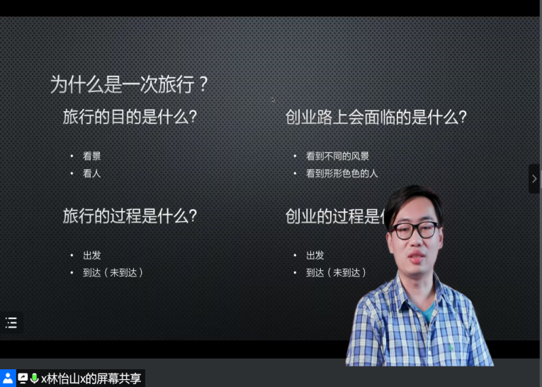 林老师把创业过程比喻为一场旅行,结合自己参与策划和制作网络综艺、视频课件、直播、宣传片、视频号等丰富案例的经验,为学生们讲解了创业过程中遇到的机遇、陷阱和挑战,提醒学生们特别要关注税务方面的知识。