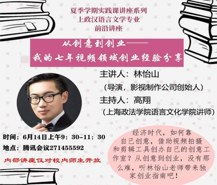 6月14日上午,应语言文化学院邀请,识唯(上海)文化传播有限公司创始人、导演林怡山老师在线为学生举办了一场创业指导讲座,题为“从创意到创业——我的七年视频领域创业经验分享”。讲座设在夏季学期实务课“经典文学IP研读与产业化孵化工作坊”课堂上,以腾讯会议形式展开,约50名学生参加并进行互动。
