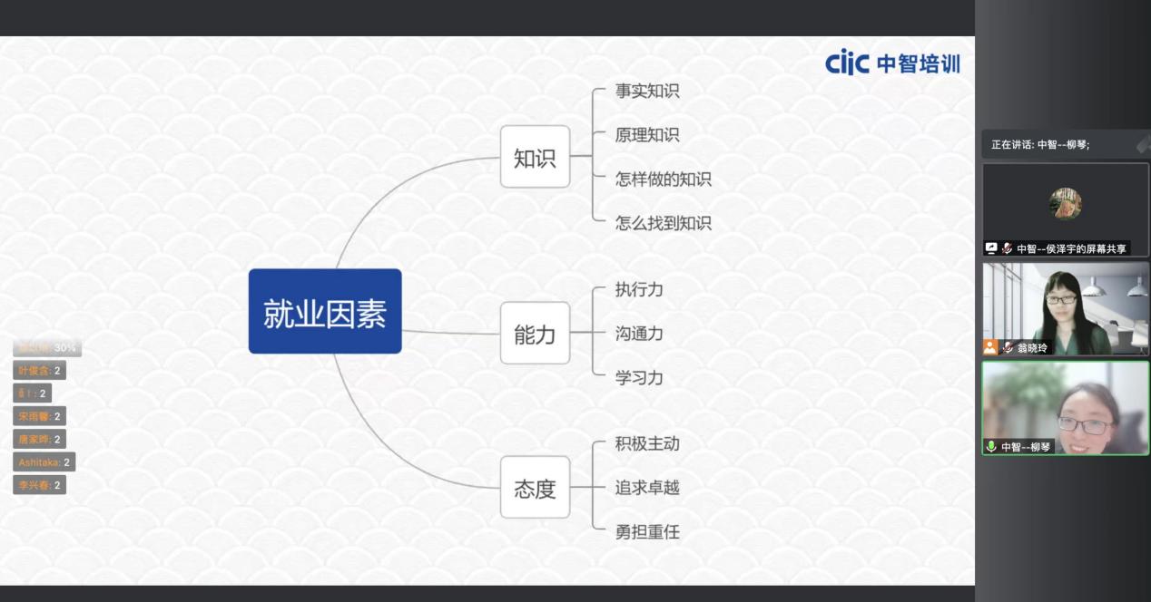 7月1日晚上,应语言文化学院邀请,上海中智教育培训有限公司总经理柳琴在线为学生带来题为“职场力提升与职业规划”的专场讲座。该讲座为汉语国际教育专业夏季实务课程系列讲座之一,由语言文化学院副教授翁晓玲老师主持,70多名学生参加。