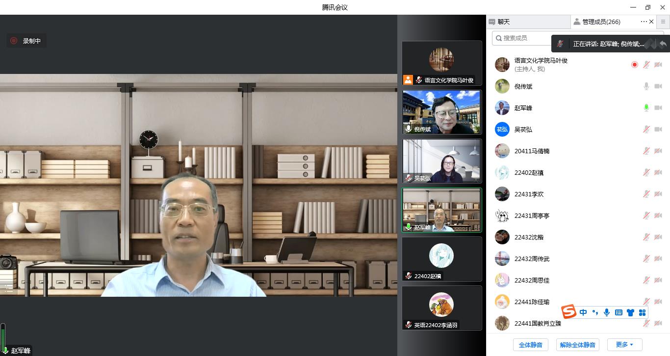 10月11日下午,语言文化学院(国际交流学院)举办语言文化讲坛第二十五讲,邀请广东外语外贸大学翻译学研究中心主任,高级翻译学院赵军峰教授为学院师生作题为“新时代中国特色法治术语的翻译策略:立格与传意”的线上讲座,讲座由语言文化学院MTI中心主任吴苌弘副教授主持,300余名师生参加。