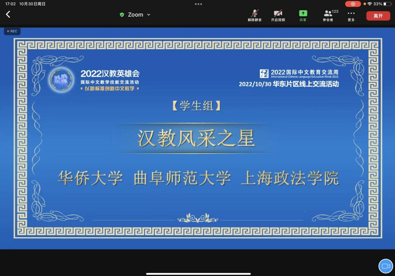 10月30日,2022“汉教英雄会”华东片区国际中文教学技能交流活动圆满落幕。语言文化学院(国际交流学院)汉语国际教育专业学生团队在华东片区49所高校的62支队伍中脱颖而出,成功入围华东片区国际中文教学技能线上交流名单,并最终获得“汉教风采之星”称号。此次活动是我院汉语国际教育专业学生第一次组队参加,由汉语国际教育教研室主任翁晓玲副教授担任指导教师,董一禾、王艺垠、宋雨馨、黄思婷、李添娇五位汉语国际教育专业本科生组成。