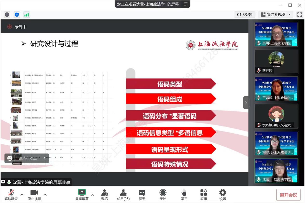 11月12—13日,语言文化学院(国际交流学院)翁晓玲副教授带领我院王蓉蓉、沈蕾、吴妍三名学生应邀参加“全球性对话与当代修辞学”中国修辞学会2022年学术年会(线上),并在会上作题为“上海商业街区店名招牌语言景观研究——以南京东路、城隍庙一带为例”的学术汇报,获得较大反响。