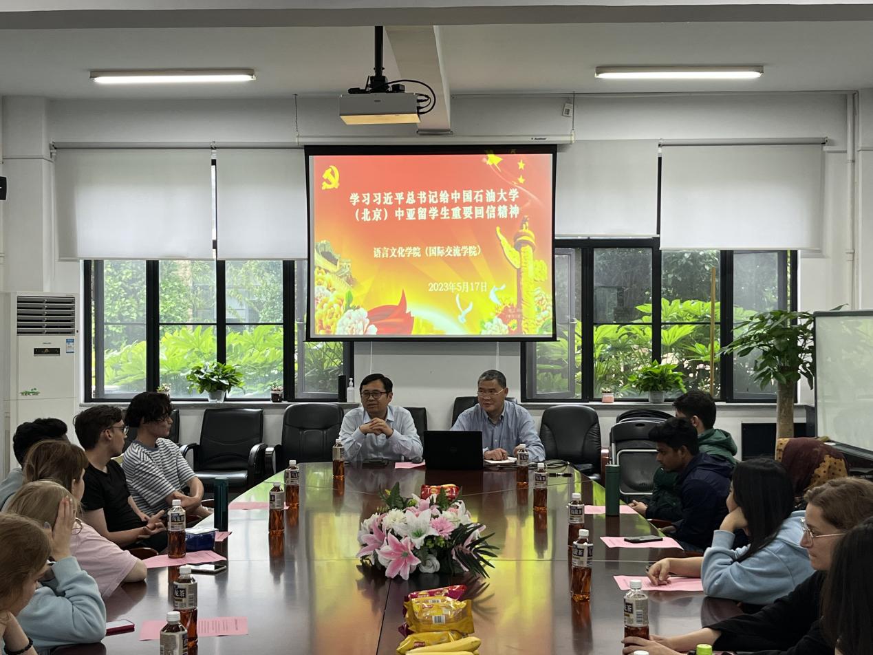 近日,国家主席习近平复信中国石油大学(北京)的中亚留学生,鼓励他们为推动中国同中亚国家关系发展作出更大贡献。5月17日中午,语言文化学院(国际交流学院)在明文苑A1-101会议室举行留学生座谈会,深入学习习近平主席给中国石油大学(北京)中亚留学生重要回信精神。党总支书记魏传成,辅导员周占军、杨炎烽、留学生代表参加了座谈会。