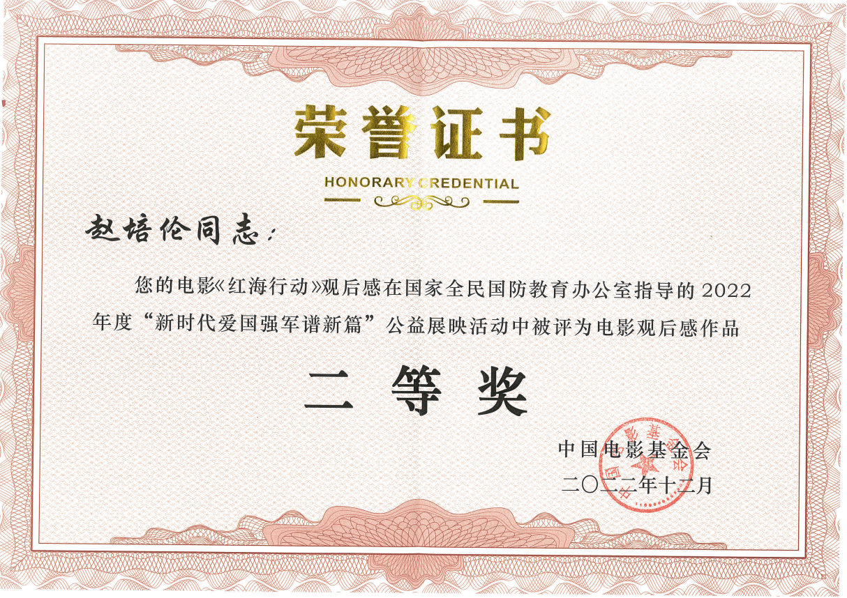 为深入学习贯彻习近平新时代中国特色社会主义思想,进一步加强大学生国防教育,丰富国防教育载体、方式和内容,语言文化学院(国际交流学院)积极组织学生参加了由国家全民国防教育办公室指导、中国电影基金会举办的“全民国防教育万映计划”之“新时代爱国强军谱新篇”公益展映活动。本次活动由学院辅导员周占军担任指导教师,组织学生认真撰写电影观后感。最终,赵培伦的《红海行动》观后感、孙焕然的《筑成血肉的长城》两篇作品荣获全国二等奖。