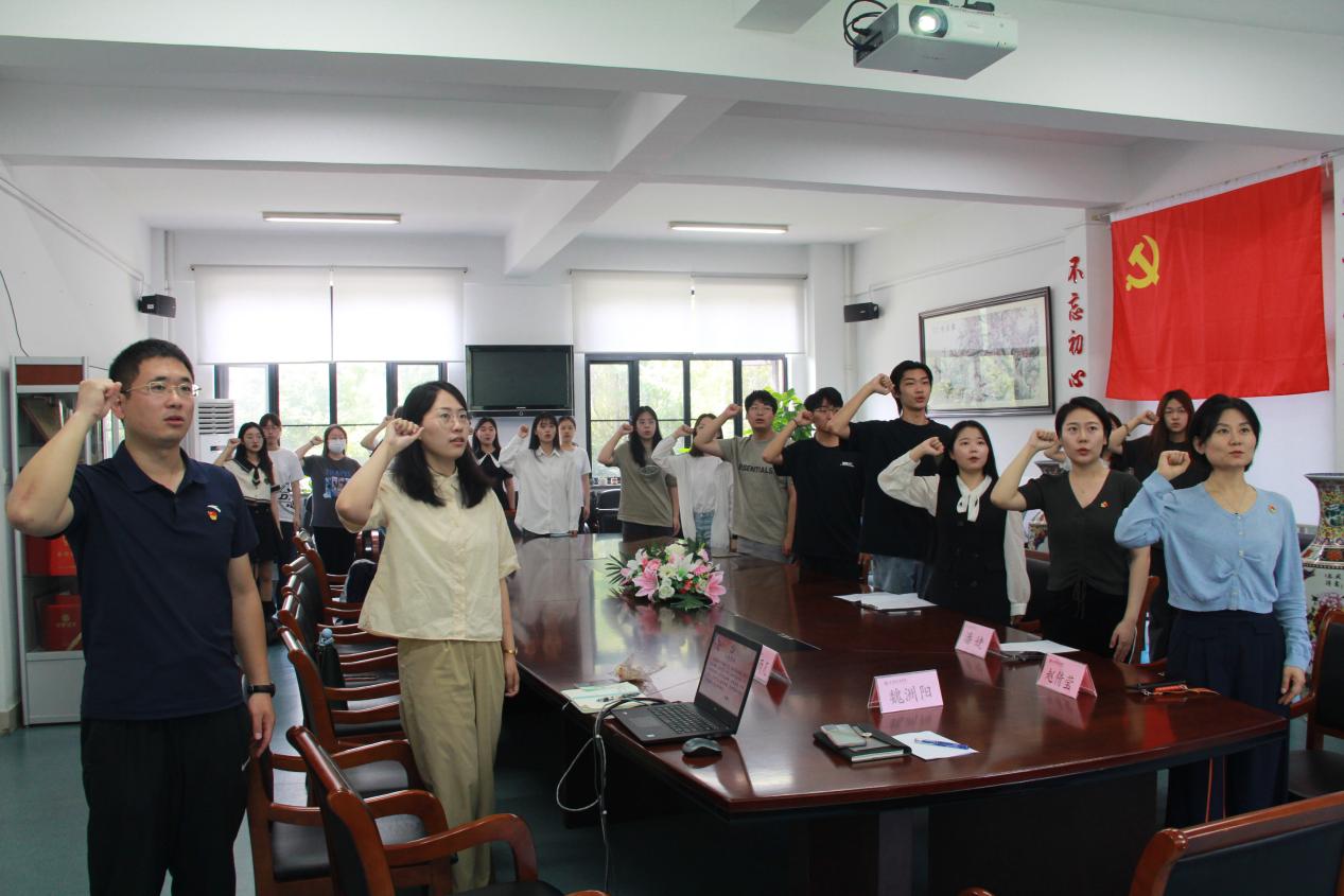 近日,语言文化学院(国际交流学院)党总支举行新党员入党宣誓仪式。学院党总支副书记魏洲阳、上政第36学生党支部书记潘婕、上政第40学生党支部书记赵倩莹和2023年上半年新发展的全体学生预备党员参加,仪式由组织员丁雨凡主持。
