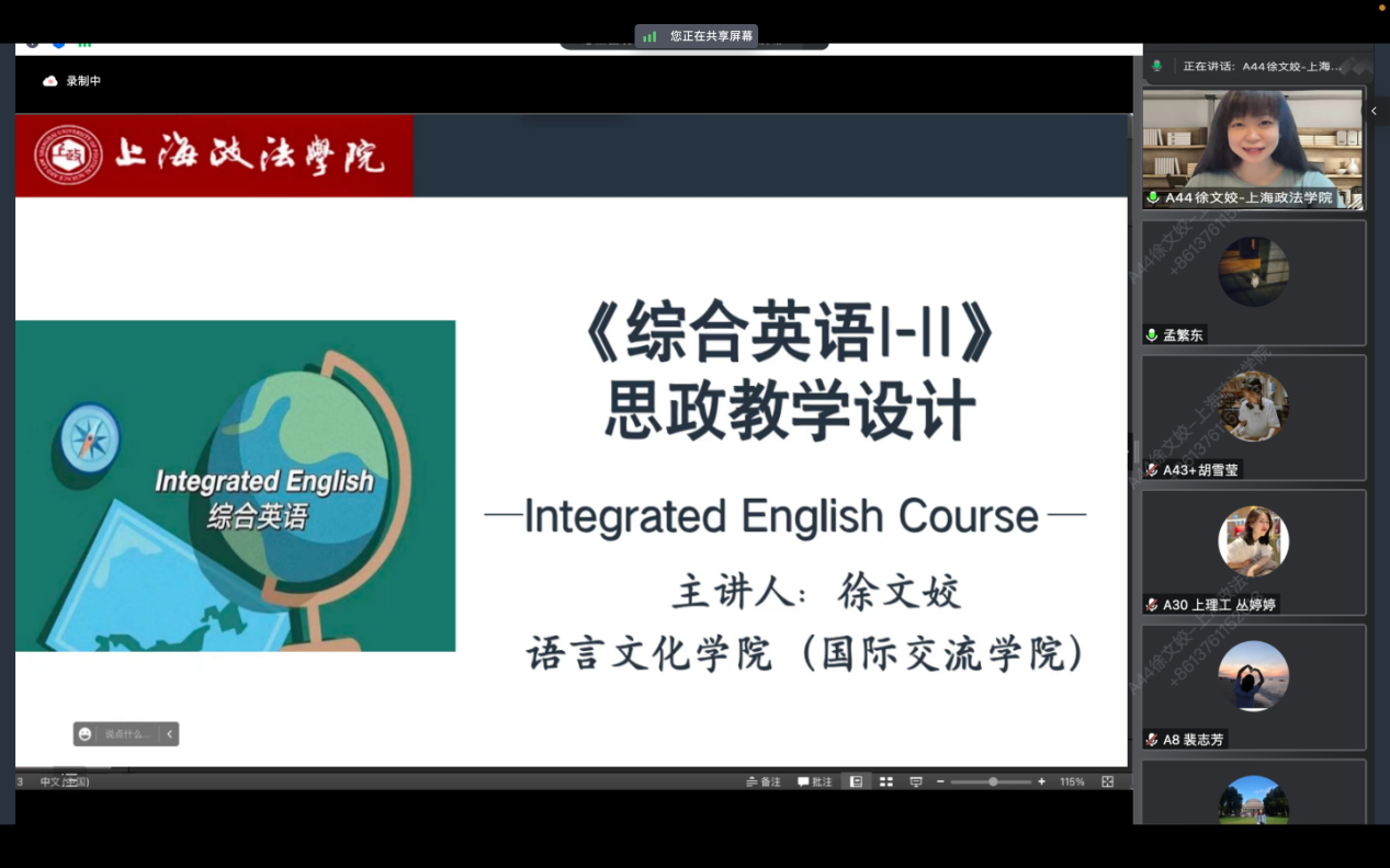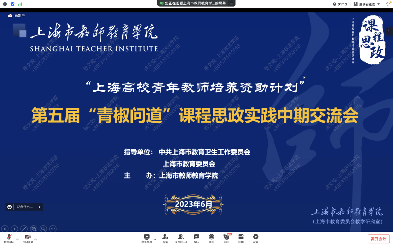 6月25日,“上海高校青年教师培养资助计划”第五届“青椒问道”课程思政实践中期交流会成功举办。我校语言文化学院徐文姣老师作为2022年“上海高校青年教师培养资助计划”重点资助对象受邀参与该研讨活动,并就《综合英语》课程的思政教学设计进行分享交流,得到了与会专家、老师的高度评价。