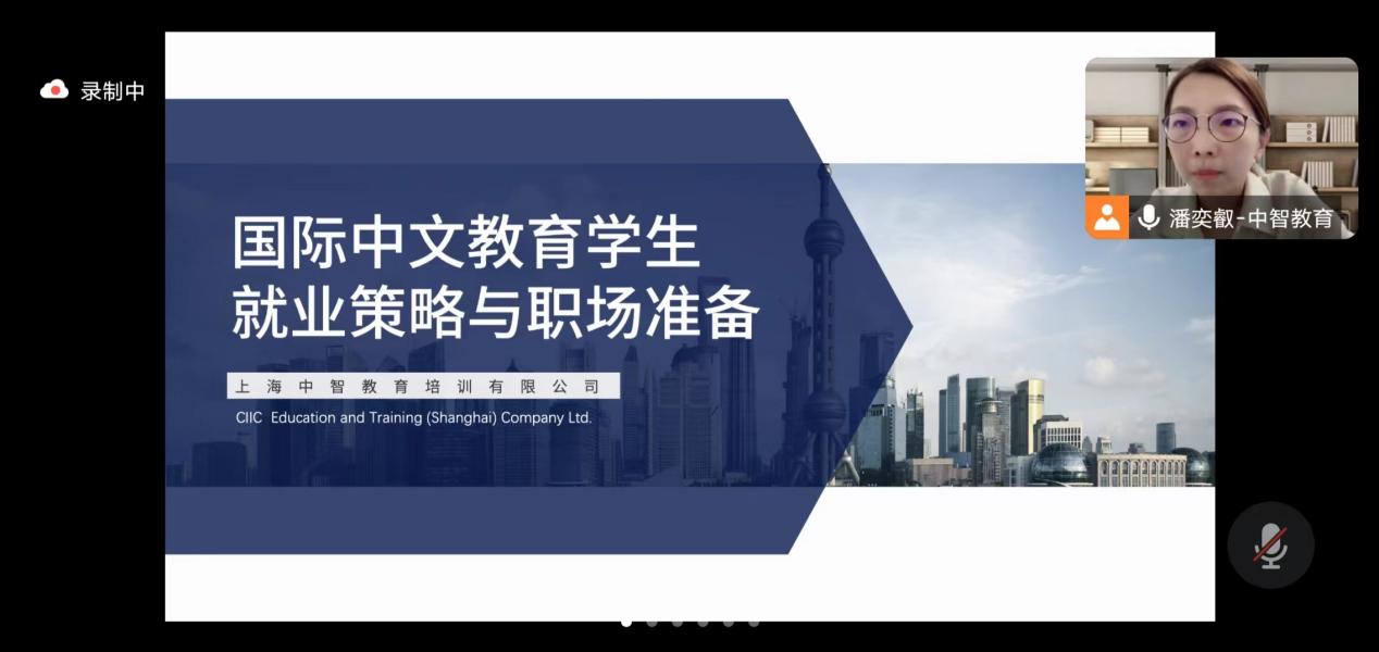 7月14日下午,语言文化学院邀请上海中智教育培训有限公司教研中心总监、英国伦敦大学学院教育研究院硕士潘奕叡在线为学生带来题为“国际中文教育学生就业策略与职场准备”的专场讲座。该讲座为汉语国际教育专业夏季实务课程的系列讲座,由汉语国际教育专业教研室主任翁晓玲主持,40多名学生参加。