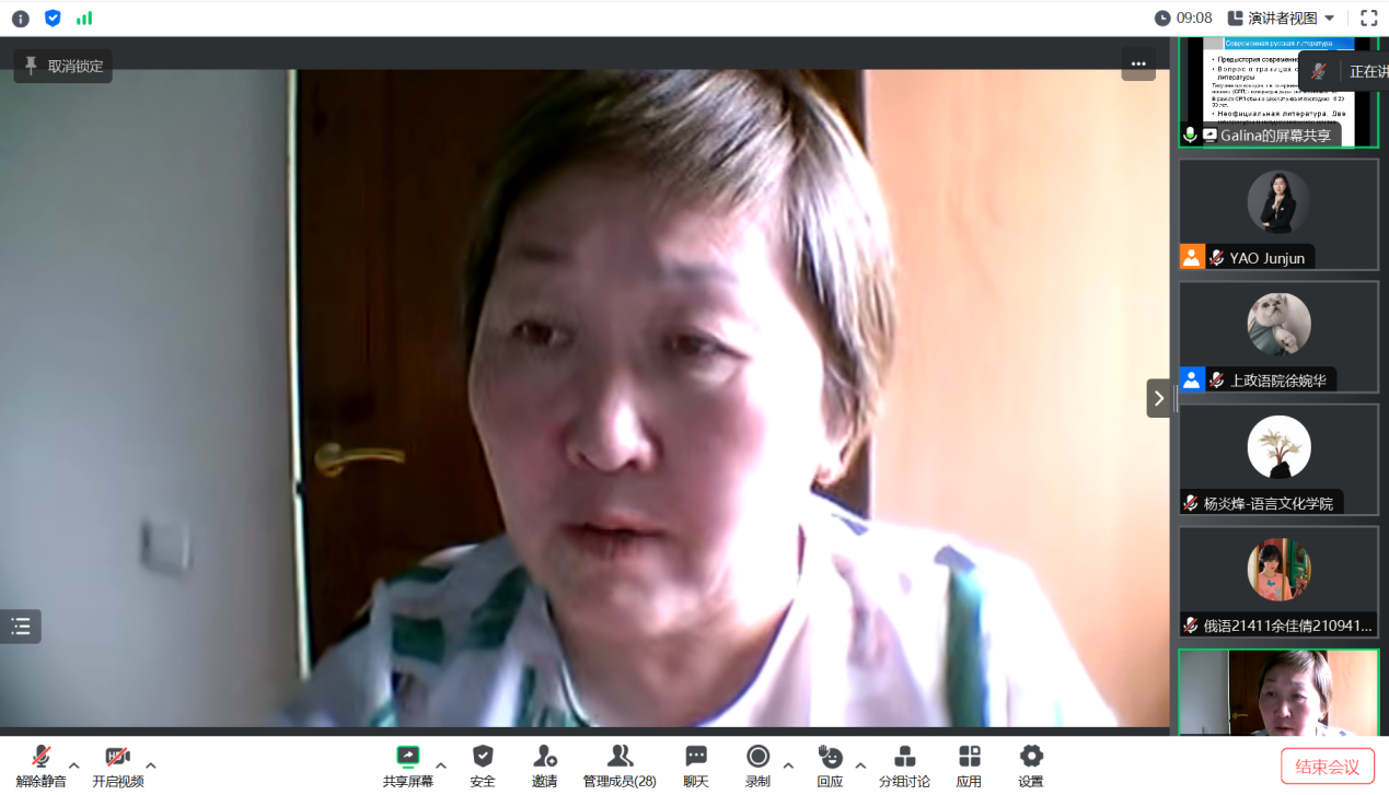 在讲座中,巴杜耶娃副教授指出提到,俄罗斯当代文学一般指苏联解体后近20-30年的文学过程,当代文学的发展与19世纪的现实主义文学,20世纪初白银时代的现代主义文学、苏联时期的社会主义现实主义文学,以及苏联时期脱离检查制度的“非正式文学”等有着溯源关系,社会政治变化对文学创作有着深刻的影响,在创作风格多样化的今天,提倡保留传统价值的“新现实主义”,替代“后现代主义”的“元现代主义”是俄罗斯当代文学中较为突出的流派。巴杜耶娃副教授还指出,俄罗斯当代文学中涌现大批新作家和新作品,我们可以通过俄罗斯设立的一系列文学奖获得名单了解当下的著名作家和优秀作品,例如:(1991年设立的)布克奖 (Букеровская премия)、(1992年设立的)小布克奖(Малая Буреровская)、(2001年设立的)国家畅销书(Национальный бестселлер)、(1991年设立的)凯旋奖(Триумф)、(2003年设立的)亚斯纳亚波亚纳奖(Ясная Поляна)、(2006年设立的)大书奖(Большая книга)等等。随后,巴杜耶娃副教授向我校俄语专业的学生推荐了一系列值得阅读的作家和书目。巴杜耶娃副教授认为,她表示,随着大众传媒的普及,大众文学和精英文学的界限在交融,文学作品的影视化是文化对话的延续,能有助于提升大众的阅读兴趣。
