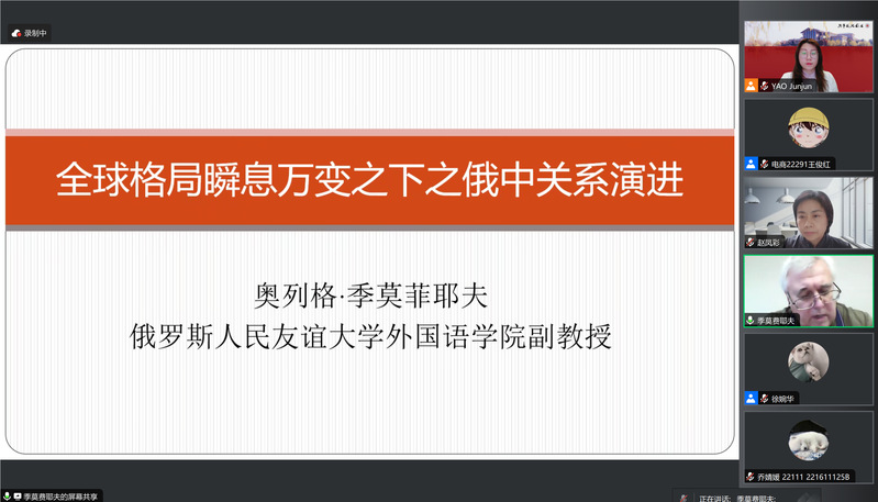 11月9日下午,我校国际伙伴周秋季“海外讲坛”总第82讲——“全球格局瞬息万变下俄中关系的演进”在线举办。俄罗斯人民友谊大学副教授Oleg Timofeev(奥列格·季莫费耶夫)受邀主讲。讲座由语言文化学院(国际交流学院)俄语教研室主任赵凤彩主持,学校近百名师生报名参加。