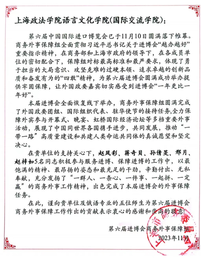 近日,语言文化学院(国际交流学院)收到中国国际进口博览会的来信,表扬了俄语专业教师赵凤彩副教授和蒋奇贝、孙倩旻、邢月、赵梓如4名2023级俄语翻译硕士研究生在第六届中国国际进口博览会期间,作为长期翻译志愿者在志愿服务工作中的出色表现。