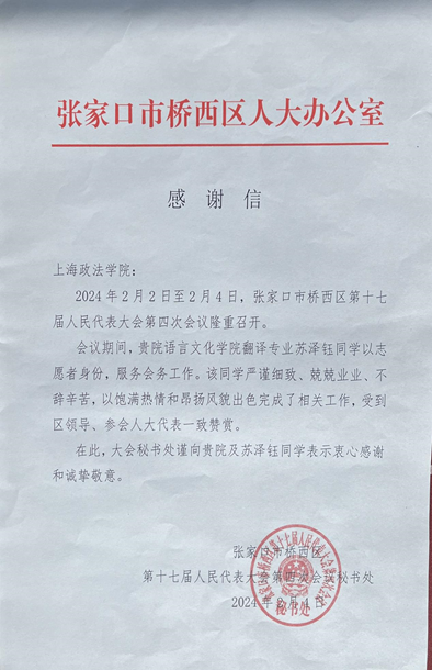 近日,语言文化学院(国际交流学院)收到翻译专业23级本科生苏泽钰带来的一封来自家乡的感谢信。信中对苏泽钰在寒假期间参加张家口市桥西区第十七届人民代表大会第四次会议的志愿服务工作表示肯定,并对学校致以感谢。