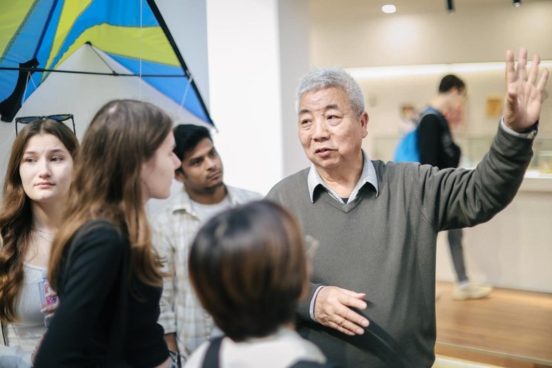 活动伊始,上海市风筝协会会长、风筝传承人陆诚祥老师带领留学生们参观了上海市风筝博物馆。陆诚祥老师向大家介绍道:“风筝又名纸鸢,它的故乡在中国,距今已有2000多年的历史。你们留学生不远万里,从世界各地来到中国,就像风筝一样,那根线就是对国对家的思念。”陆会长还生动的描述了风筝飞行原理,并通过形象的比喻向大家形容了风筝与线的关系。大家不但理解了逆风飞翔的原理,加深了对我国的风筝历史和传统文化的认识,也更加深刻感受到风筝这项运动带来的人生含义。