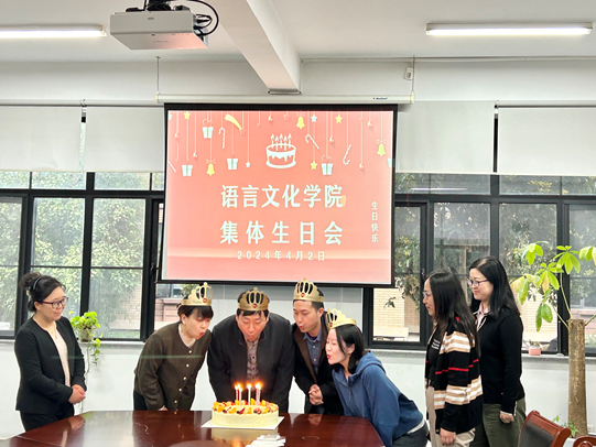 4月2日中午,语言文化学院分工会在明文苑A1-101为四月份生日的教职工举办了一场温馨的集体生日会,为当月过生日的教职工们送上了一份特别的惊喜。