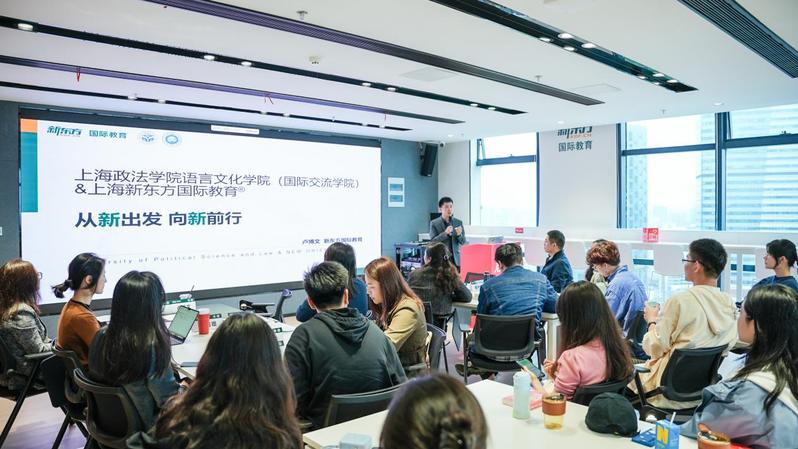 上海新东方国际教育培训中心总经理助理关怡对学院师生一行的到访表示热烈欢迎,并就企业历史沿革、行业优势、发展态势及目标定位等情况作了详细介绍。关怡表示,新东方国际教育培训中心作为行业领先的教育机构,在发展历程中积攒了广泛的影响力和辐射力,希望能在产学融合、联动办赛等层面与语言文化学院(国际交流学院)开展合作,共同探寻合作模式,构建更加紧密、务实的协作关系。
