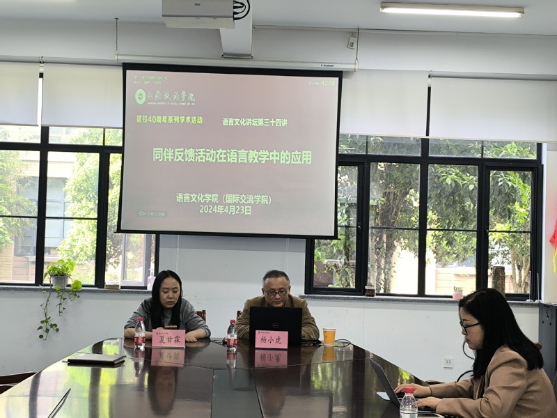 4月23日下午,语言文化学院(国际交流学院)在明文苑A1-101 举办了建校40周校系列学术活动暨语言文化讲坛第三十四讲。本次讲坛邀请同济大学英语系教授、博士生导师、博士后合作导师杨小虎教授为学院师生作了“同伴反馈活动在语言教学中的应用”的学术讲座。该讲座由副院长夏甘霖主持。