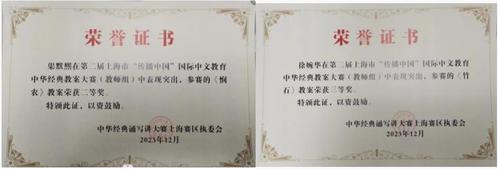两位老师的教案内容选取了能够充分体现中华优秀文化、爱国情怀和时代精神的经典诗文。在总结借鉴第一届国际中文中华经典教案大赛经验的基础上,经过为期近半年的培训与比赛,两位老师凭借其丰富的教学经验、独到的教学设计,为学校争得了荣誉。