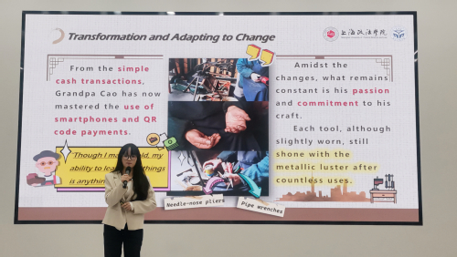 为了做好本次比赛的组织工作,党委宣传部专门发布校内遴选通知,面向全校征集作品素材。语言文化学院(国际交流学院)通过举办院内“求实杯”英语演讲比赛,确定指导教师并选拔报送了最具有竞争力的学生参赛。本次获奖的王陈慕蓉同学,其演讲作品主题为《鞋语者》,从“我在——上海的城市精神品格”切入,围绕弄堂中的小皮匠在上海变迁中的沉浮发展,带人们走进以心守护上海城市记忆和文化脉络的老一辈手工匠人。