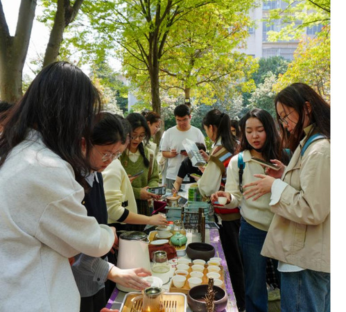 4月8日下午,语言文化学院、朴归茶道社在学校青马广场举办了首场“2025国际茶日暨第十七届全民饮茶活动”。活动主题为“茶文化进校园——六大茶类品鉴与茶文化沉浸体验”。茶道社志愿者现场布置了精美茶席,通过六大茶类冲泡,茶艺展示,茶知识趣味互动等形式,搭建起大学生了解茶文化的平台,构建了生动的校园茶文化对话空间。