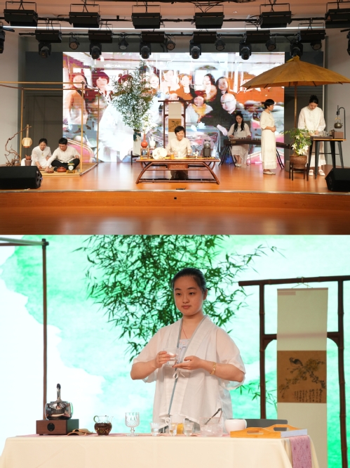 在茶艺展示环节,青浦区茶文化协会和海派博物馆式茶馆—弄堂问茶分别带来了两段精彩的茶艺表演。青浦区茶文化协会的表演主题为《千年传承 吾辈接力》,由徐琴精心策划、创编并担任旁白,协会成员杨林鸿、杜丽萍、汤晓艳、张家宁、戚中豪精彩演绎,李茜茜以古筝配乐。茶艺师们动作规范典雅,古筝配乐古朴悠扬,生动呈现茶文化千年传承的脉络,传递出“传承有我,吾辈担当”的坚定信念。海派博物馆式茶馆—弄堂问茶的表演以《茶无界》为题,由茶艺师孙筱薇策划、创编并亲自演绎,以海派茶馆文化为底蕴,打破了传统茶艺的界限,诠释了茶在现代生活场景与多元文化交融中的创新表达。