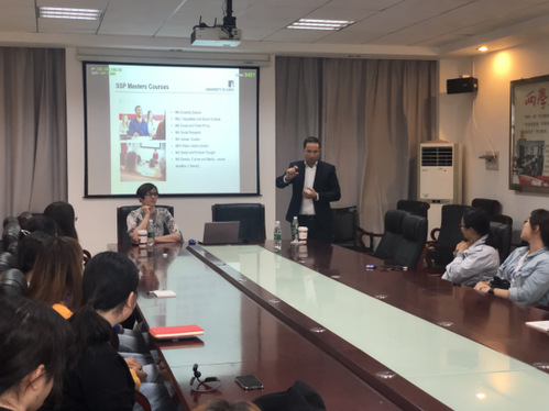 讲座前,党委宣传部副部长、政府管理学院副教授刘伟伟接待了来访嘉宾。刘伟伟副教授对利兹大学教授的到访表示欢迎和感谢,双方对之前的合作十分满意,并且成果颇丰,希望双方可以继续加深合作,为更多的学生提供国际交流平台和机会。下午两点,讲座开始。讲座由政府管理学院张驰老师主持。Adam Tyson教授详细介绍了利兹大学的概况以及相关的合作项目,对利兹大学的地理位置、周边环境、历史、开设的硕士专业等学校概况做了简单介绍,并对与政府管理学院已合作的“3+1”政治学及社会学项目耐心做了讲解。