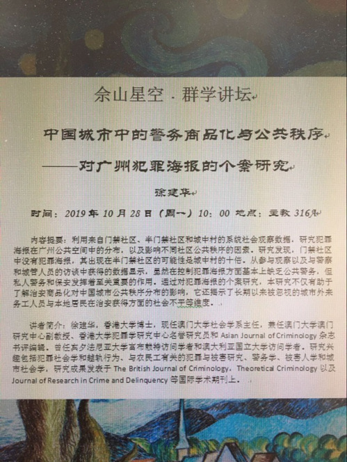 10月28日上午,澳门大学社会学系主任徐建华教授应邀来我院讲学,在主教316A进行了一场题为“中国城市中的警务商品化与公共秩序:对广州犯罪海报的个案研究”的学术报告。