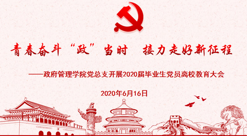 为提高站位,切实做好毕业生党员思想政治教育工作,促进毕业生党员在走向社会后自觉践行党的宗旨、时刻保持共产党员先进性,发挥党员先锋模范作用,政府管理学院党总支于5月初即制定了以“青春奋斗‘政’当时 为梦扬帆新征程”为主题的2020届毕业生党员离校教育方案,并先后组织开展重温誓词、主题党日、寄语传承、志愿服务、先进表彰等一系列活动,成效颇丰。本次线上大会,为主题教育画上圆满句号。