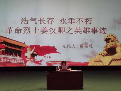 会场秩序井然,气氛庄重肃穆,同学们认真倾听着的陈渭珠女士讲述。陈老师首先追忆了她的公公姜汉卿烈士光荣而壮烈的一生。姜汉卿是中华人民共和国成立前在上海进行党的地下工作的英雄,在隐秘战线上与敌人斗智斗勇。1949年5月14日,姜汉卿被叛徒出卖,为保护党的机密和转移地下党革命同志不幸被捕,于5月20日上海解放前7天,被国民党枪杀于上海宋公园。姜汉卿一生爱党爱国,为了人民的解放事业不懈奋斗,勇于和反动派作斗争,为党和人民的事业奉献终生。姜汉卿烈士永垂不朽!