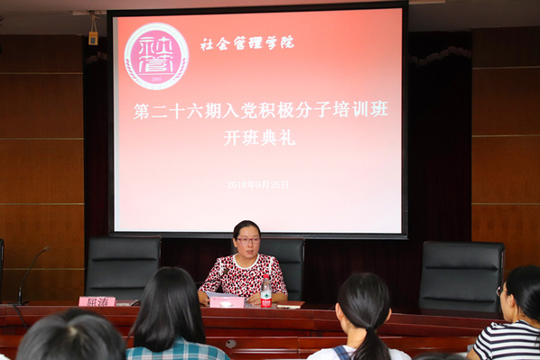 9月25日下午, 在深入推进“两学一做”学习教育常态化制度化,深入学习贯彻党的十九大精神之际,根据《中国共产党发展党员工作细则》的规定,社会管理学院在求实楼513举行第26期入党积极分子培训班开班典礼。学院党总支副书记陈娜出席并作开班动员,会议由组织员骆胖主持。学生党员、第25期入党积极分子与团学骨干共同参会。