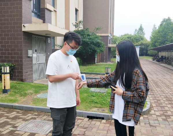 上政第33-35学生党支部毕业生党员加入社区志愿者服务行列,实行一个支部包干一栋宿舍楼,协助宿管进行入楼身份验证、体温测量、防疫手册分发等工作。