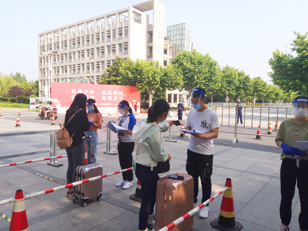 全力以“复”,党员先行!在志愿服务工作中,党员身戴党徽,勇于亮身份、积极传播正能量,为全体毕业生的安全复学保驾护航。