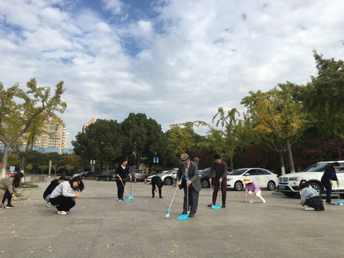 在活动过程中,学院教师们拿着扫帚和垃圾铲,分段、分片地整理和清扫了博物馆前空旷场地的垃圾与落叶。整个活动过程井然有序,大家个个不怕脏、不怕累,干劲十足,努力为环境美化贡献自己的一份力量。
