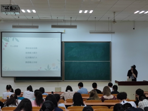 实习说明会的最后,2019级学生石寒冰作为“优秀实习生”,向大家分享了她实习的心得与经验。她从自己在大一时想法摇摆不定到在实习过程中逐渐明确目标讲起,循序渐进的讲述了她实习的历程以及大学实习的重要性与意义。