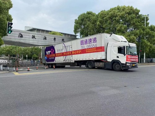 悬挂着的“山海情深,同心抗疫”的横幅,运输货车从贵州出发,驰援千里抵达上海,展现了黔沪两地深深的情谊。此次捐赠的物资包括:口罩、隔离衣、防护服、生活用品、食品等,总计价值73.49余元,将会全部用于新利18官方客服的疫情防控工作。