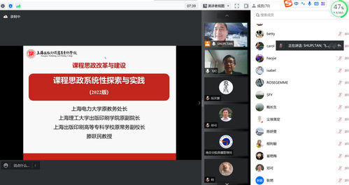 5月24日下午,由政府管理学院和经济管理学院联合主办的“名师讲坛”在线讲座“课程思政系统性探索与实践”顺利举行。本次讲座由上海出版印刷高等专科学校原常务副校长滕跃民教授主讲,政府管理学院副院长谈谭主持。政府管理学院党总支书记连淑芳教授、经济管理学院鲍长生副院长等校内外近百名教师参加了讲座。