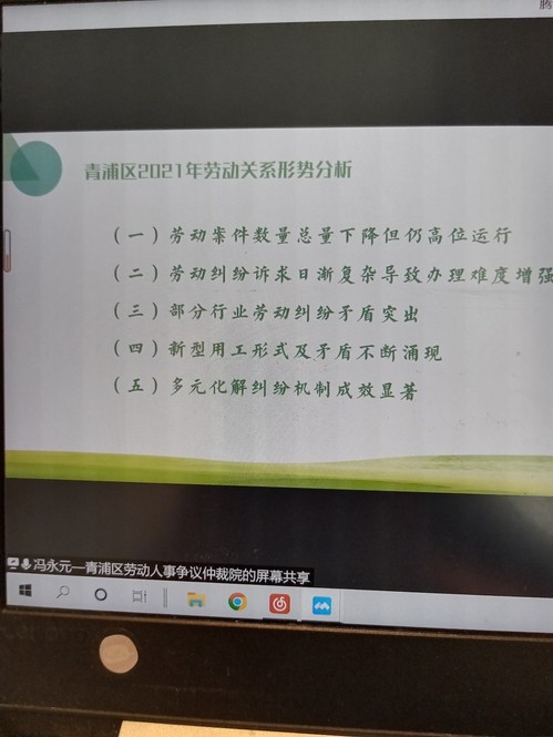 在上海新冠疫情这个特殊时期,冯永元老师以新冠肺炎期间劳动法律关系分析为主题,首先分析了2021与2022年青浦区劳动关系形势及其形势研判;其次,对 2020年与2022年两轮疫情基本情况进行简单概括,其中包括劳动争议可涉及的时间线梳理、重要概念阐释和相关政策规定等。