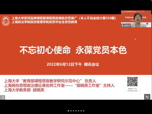 为引导毕业生党员勇担时代重任,进一步强化党员意识,6月12日,政府管理学院党总支邀请上海大学顾晓英教授讲授“不忘初心使命,永葆党员本色”专题党课。本次党课由政府管理学院学生党建中心主任刘洋主持,学院2022届96名毕业生党员参与聆听。