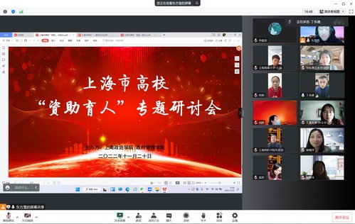 2022年11月20日下午13:00,政府管理学院邀请上海市各高校学生工作相关人员,举办了上海市高校“资助育人”专题研讨会,在腾讯会议顺利进行,共同探索资助育人长效机制。本次研讨会邀请了来自上海交通大学、上海大学、华东政法大学、华东理工大学、东华大学、上海海事大学、上海理工大学、上海健康医学院、上海电机学院以及上海工艺美术职业学院的十余位老师共同参与。我校学生工作部部长丁永建参会。会议由政府管理学院党总支副书记闯晓燕主持。