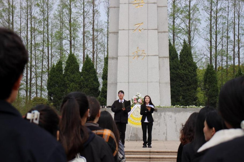 第二项议程,学生代表齐高德和周子琣向纪念碑敬献花圈,全体成员肃立静默,在碑前三鞠躬缅怀烈士;