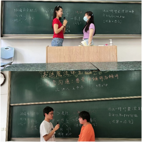 蔡翎琳同学上台发言。她回忆,自己一次在武术基地给剑柄缠胶布,却忘记带剪刀,从而无法拔剑练剑,这使她很沮丧。接着,谭娴同学发言,她们小组参加比赛,通过电话成功联系到了指导老师,老师的同意使她们感到十分高兴。王平乐老师对此点评,两位同学准确表达了自己的感受而未夹杂评论性语句,同时,感受的表达还可以参考词汇表,再具体一些。