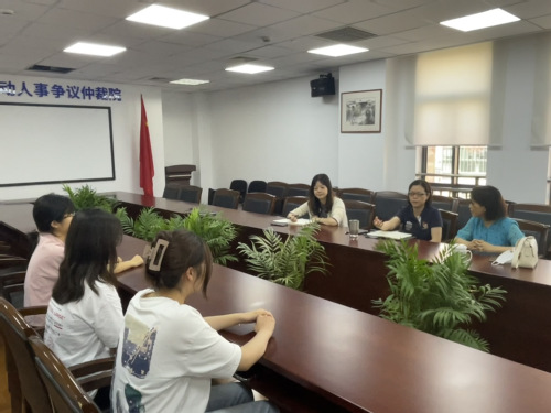 在闵行区劳动人事争议仲裁院的走访中,罗老师与李琦院长和沈老师等负责人同样进行了深入交谈,了解了实践基地对学校培养专业学生的看法和建议及实习学生的实习表现和工作内容。在交谈中,李琦院长和沈老师都对学生们的实习表现给予了表扬和鼓励,也给学生指出了实习中可以多留心注意学习的方面。罗老师也当场对学生们表示了鼓励和殷切期望,听取了学生们的实习感悟。罗老师还就多年来李琦院长给予本专业学生实践实习提供的各种热心帮助和支持表达了诚挚的谢意,并就今后继续交流与合作交换了看法。