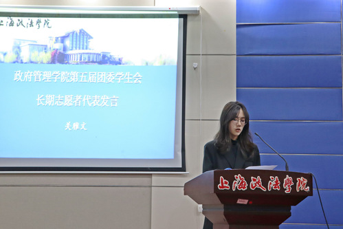 长期志愿者代表关雅文进行发言,分享了作为长期志愿者以来的感受,并提出要严格要求自己,为学院作出贡献。