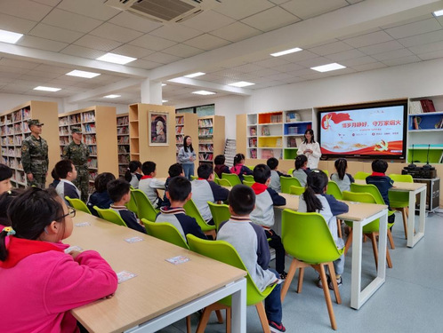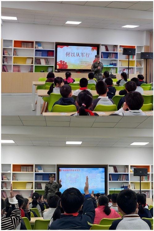 军魂团成员袁博、陈星则从国家国防体系、军兵种体系等内容出发,结合自身的入伍经历分享军旅生活,诠释军人的责任与担当。袁博以“何以从军行”为主题,讲述自己当初为何参军,通过一张张照片展现部队的饮食、住宿、训练与文体活动,讲述永不后悔的心路历程,还向大家展示了自己的荣誉徽章。陈星就什么是国防、为什么要加强国防教育展开互动问答,帮助青少年树立正确的人生观、价值观,激发爱国情感,使之成为有理想、敢担当、能吃苦、肯奋斗的时代好青年。