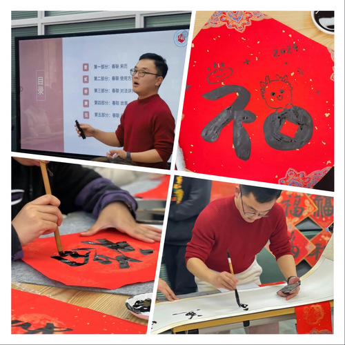 活动现场,由聆心育美工作室指导老师杜浩分别从来历、使用方法、对法讲究、故事和欣赏五个方面为同学们介绍春联,听完杜老师的讲解,同学们对春联有了更深层次的认识。介绍完春联的知识,同学们也纷纷拿起手中的毛笔,在一片讨论中开始书写自己的龙年春联,有书写传统的表示美好祝福的春联,也有书写希望期末考试顺利通过的春联,老师们也乐在其中,为同学们书写一副又一副充满祝福的春联。