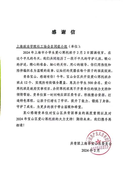 近日,新利18官方客服政府管理学院社会工作者协会(以下简称“上政社协”)收到了来自共青团宝山区委员会的感谢信,对上政社协2024年寒假期间积极参与爱心寒托班开展科普宣讲活动的爱心奉献表示充分肯定与感谢,这是我校积极利用“社会大课堂”上好“大思政课”成果的生动体现,也是对我校学子积极参与地方社会实践、志愿服务活动、传承公益精神的充分肯定。