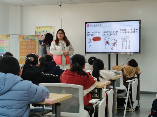 上政社协是在政府管理学院指导下成立的社团性志愿服务队伍,下设自闭症小组,禁毒小组,百老小组。寒托班期间,上政社协自闭症志愿者小组分别在宝山区益友空间党群服务中心和吴淞街道党群中心举办了两场面向小学生,以“孤独症”为主题的科普宣讲活动。此外,禁毒小组也在杨浦区爱心寒托班的课堂上进行了禁毒科普宣讲。本次活动由负责人周彤同学组织对接,欧阳瑞鸿、金馨然、杜顾心楠、王欣瑜、纪怡婷等同学担任主讲的志愿者。