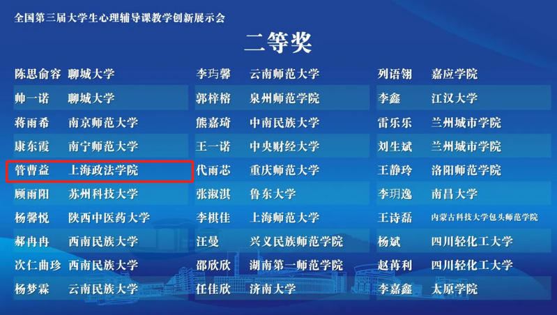 近日由教育部高等学校心理学类专业教学指导委员会主办、浙江师范大学和华东师范大学承办的全国第三届大学心理辅导课教学创新展示会在浙江桐乡顺利举办。在学校教务处的支持下,我校政府管理学院应用心理学教师姜珊带领政管21级本科生管曹益入围决赛,并喜获大赛二等奖。