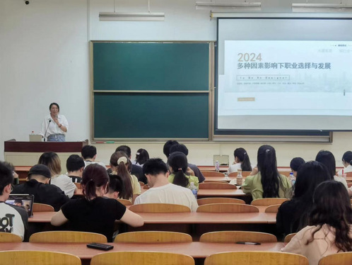 接着,上海三乖猫信息技术有限公司创始人张娜以《多种因素影响下职业道路选择与发展》为题,为同学们打开了职业规划的新视野。张娜女士结合自身创业经历与行业洞察,探讨了影响个人职业选择与发展的多种因素,包括个人兴趣、市场需求、行业趋势等,并分享了如何在复杂多变的环境中做出明智的职业决策,以及如何通过持续学习与自我提升来规划职业生涯。她的分享不仅激发了同学们对未来职业道路的无限遐想,更鼓励大家勇于探索、敢于实践。